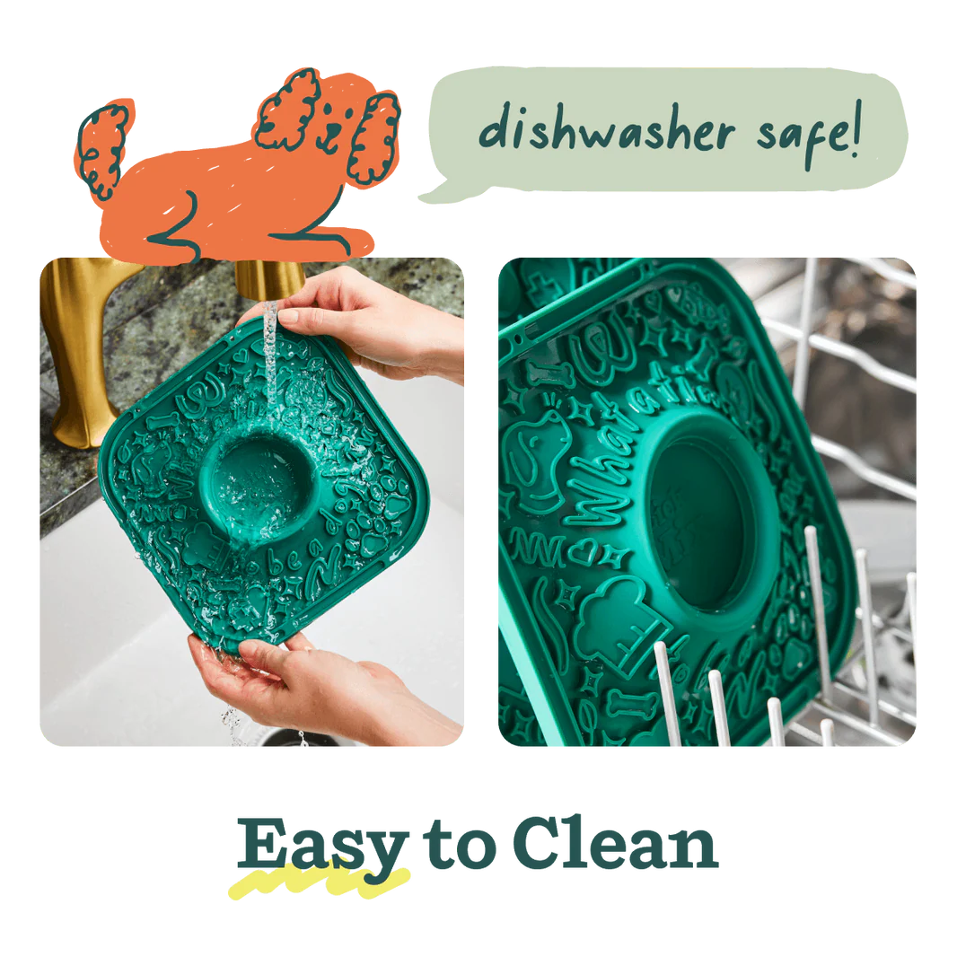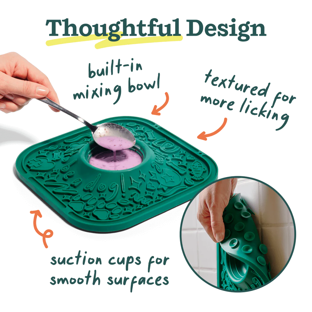 Our LickMat features suction cups for grip, is made of a non-toxic, BPA- and phthalate-free natural rubber, and comes in two colors: Forest Green and Lavender.
